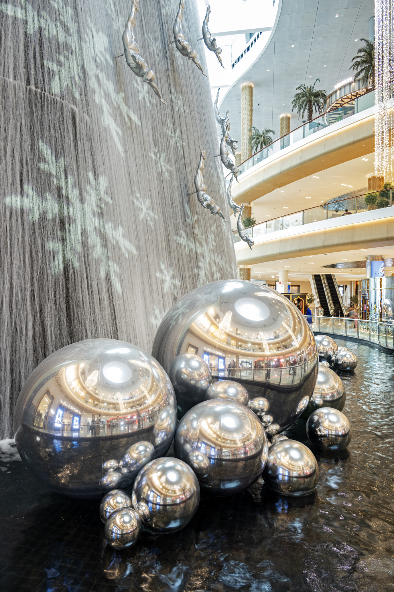Throughout the mall, 200 suspended chandeliers form a flowing canopy of light made from more than 100 kilometers of illumination. As you move beneath them, subtle shifts in reflection and glow create a constantly changing, magical atmosphere.