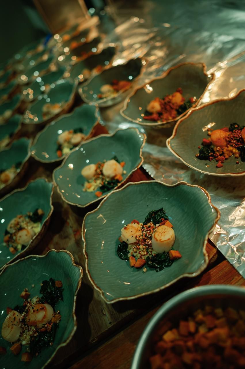 The Layering course featured fresh, locally sourced Dibba Bay oysters paired with an Egyptian “Whiskey” salad dressing and herb oil—an elegant marriage of Emirati and Egyptian flavors. The oyster shell and the porcelain plate echoed one another as vessels shaped by time, pressure, and fluid movement.