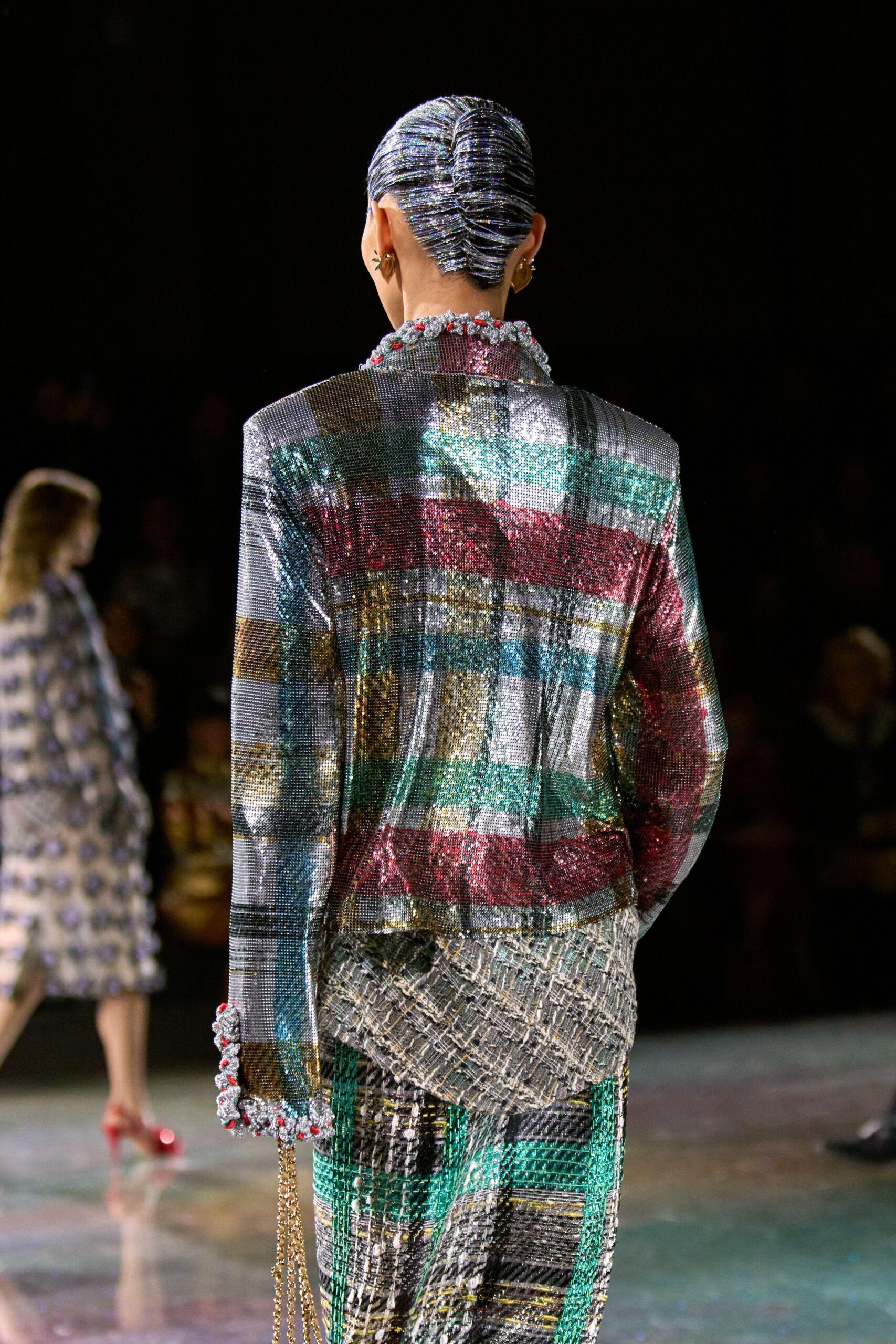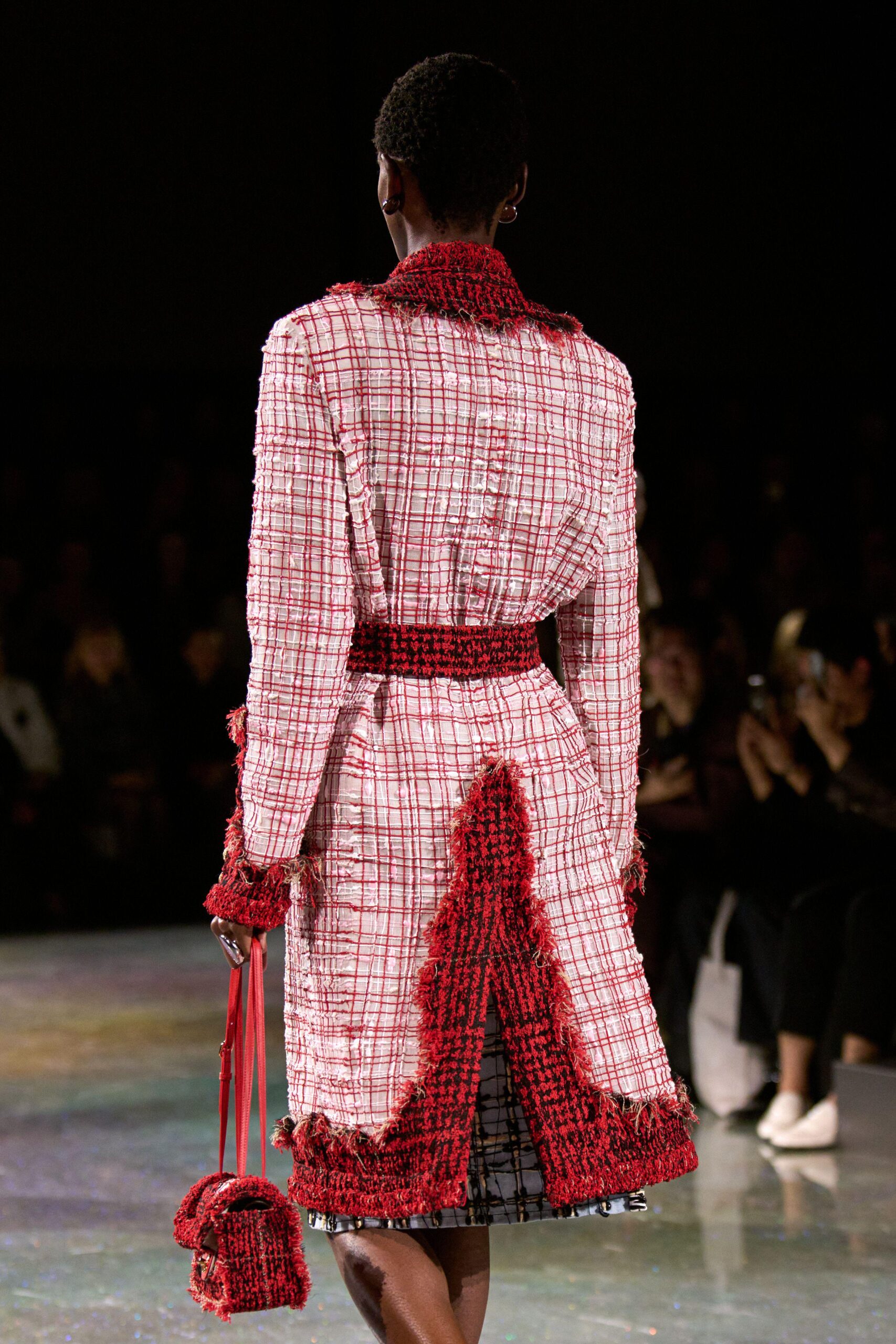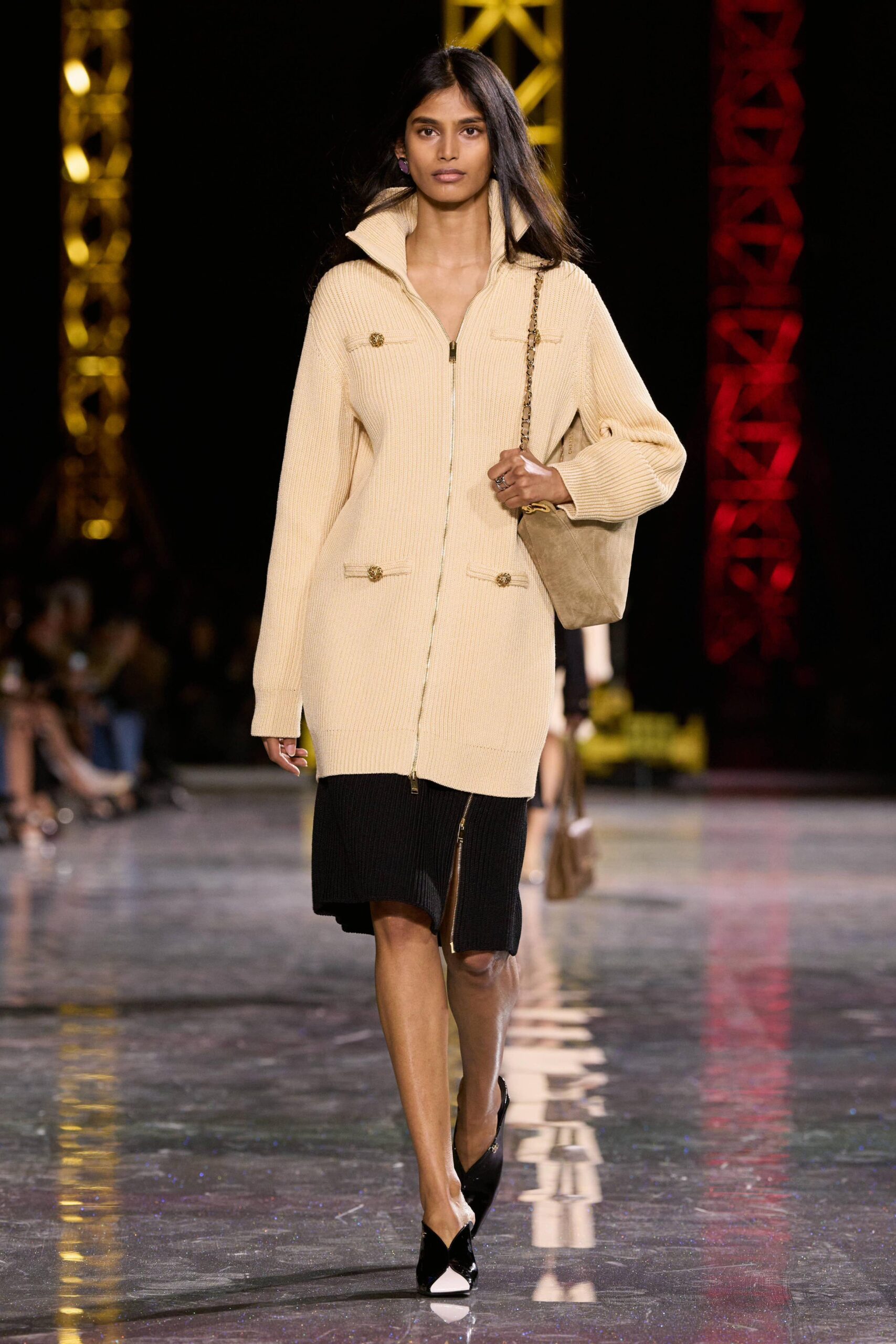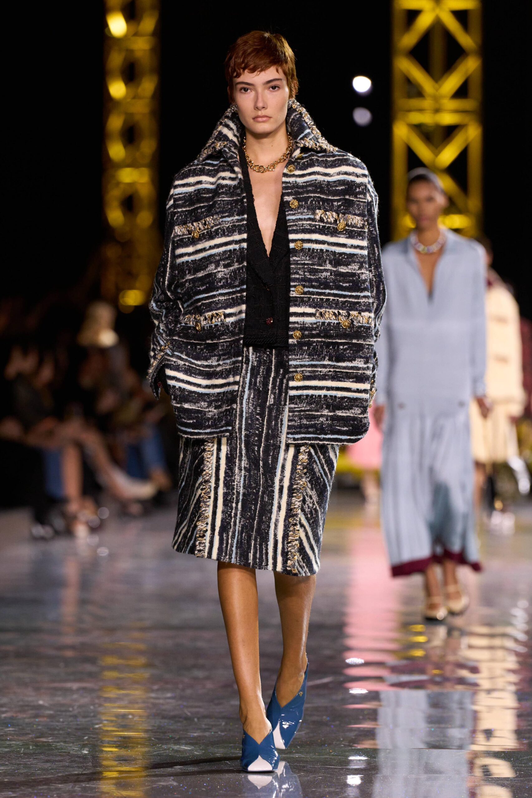 Tweed remains the foundation of the collection, though treated with notable variation. Some versions appear lighter, woven in softer tones that reflect light as the model moves, while others lean into heavier textures through dense weaves, layered knits, and substantial outerwear. This contrast between lightness and weight runs throughout the lineup, creating a rhythm that keeps the collection from feeling static.