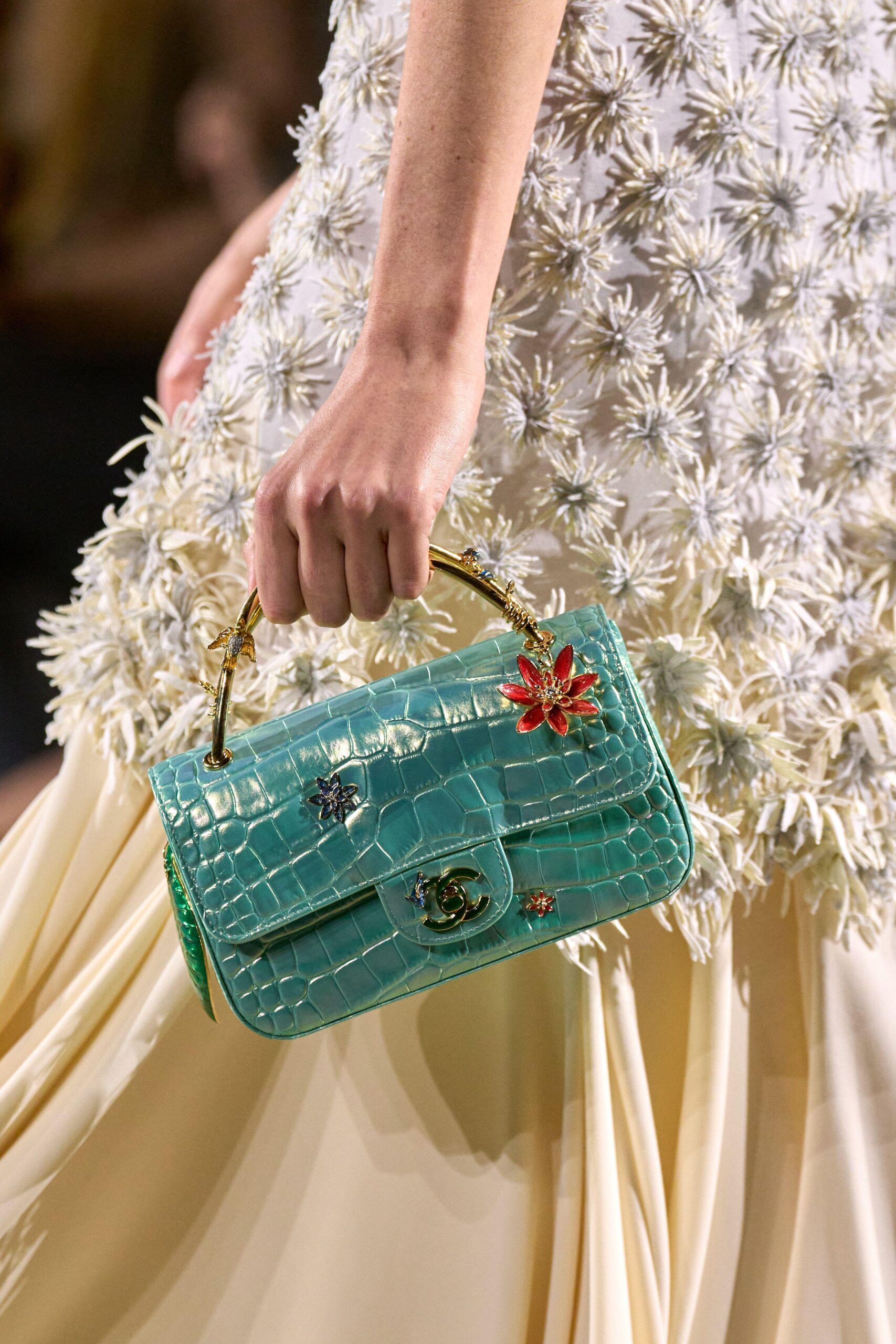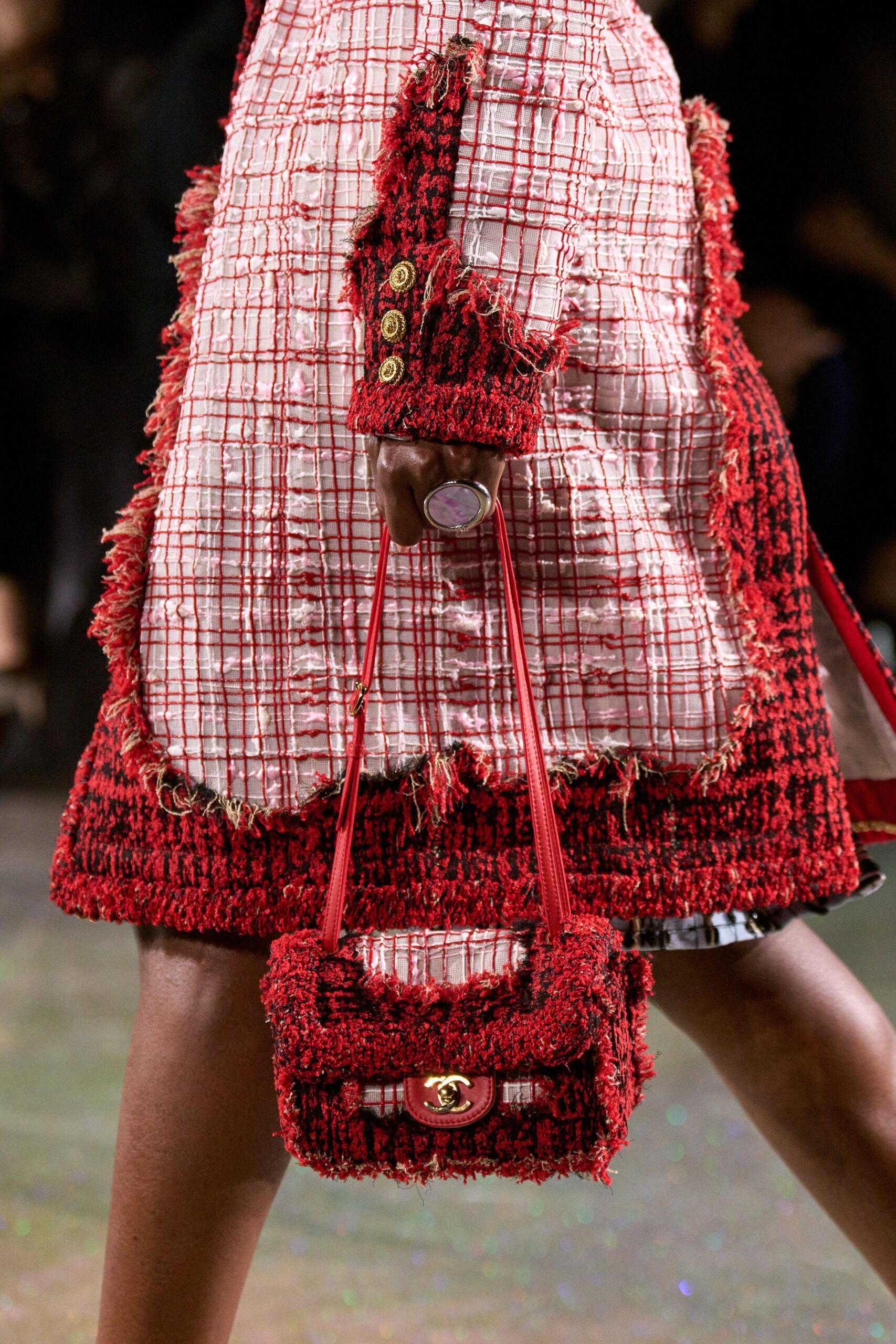 A tweed Maxi Flap offers one of the clearest departures. In one version, the central panel is left partially unfinished, revealing the structure of the fabric while the surrounding frame remains dense and textured. The effect reflects the contrast between lightness and weight seen throughout the collection, testing how far the Chanel icon can shift without losing its identity.